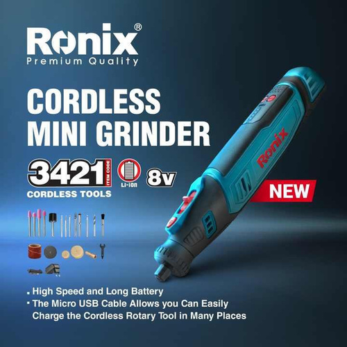 فرز مینیاتوری شارژی 3421 رونیکس مجهز به یک موتور DC 8 ولت است که سرعتی بالغ بر 30000 دور در دقیقه را تولید کرده و به ابزارگیر 3.2 میلیمتری خود منتقل میکند؛ سرعتی که در 5 حالت مختلف، در بازه 5000 تا 30000 دور در دقیقه و متناسب با سطح کار شما قابل تنظیم است.